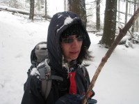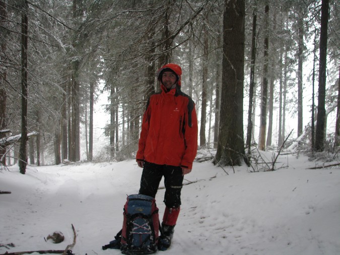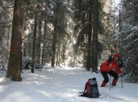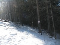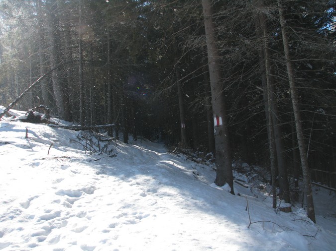 Zapada fiind compacta, fara vreo urma de poteca desfacuta, ma face sa deschid ochii cat mai larg. Gasesc un semn de marcaj. Continuam sa mergem prin padure.