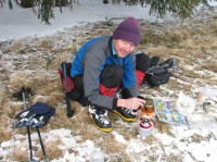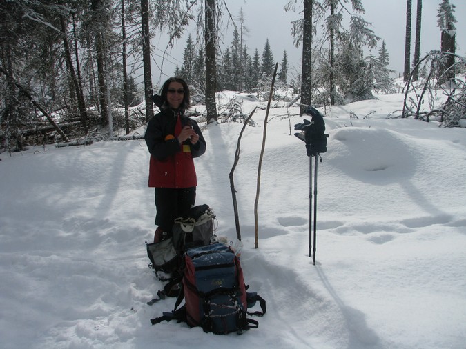 Ninge si vizibilitatea e scazuta pe alocuri. In Poiana Ciungi suntem foarte atenti la orientare.