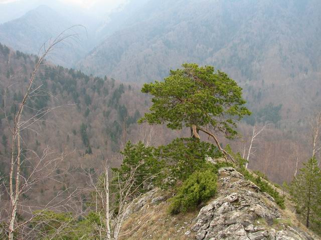 Finalul traseului Crestei Fotoreporterului este pe o muchie strajuita de un frumos pin.