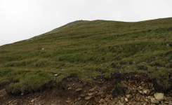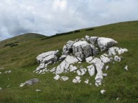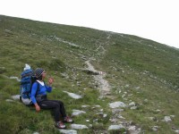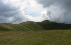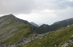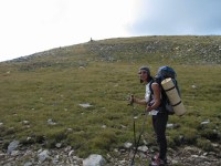 Ne trezim la prima ora a diminetii (adica in jur de 5:00). Dupa ce facem un ceai la care gustam cate ceva, pornim la traseu. Revenim prin ierburi mari  in poteca de culme. Urcam, mergand spre vest. La liziera padurii distingem steagul de pe euro-stana de care ne povestise bacita. In stanga noastra si mai in urma se vede Buila-Vanturarita. Amintiri, trasee de alpinism… La un moment dat in fata noastra se desfasoara impresionantul Vf Ursu. Ne indreptam catre acesta, pana cand suntem foarte aproape de culmea sa somitala. Facem fiecare cate o poza, bucurosi! Dupa ce urcam pe un umar, poteca larga se orienteaza in jos spre stanga. Studiind harta si busola, identific parcursul nostru care se desfasoara de-a lungul unei culmi. Nu e o poteca clara, mai degraba un hatas… Vremea dadea semne de inrautatire, norii se adunau si ceata se lasa pe culmi. Mergem anevoios prin ierburi, urcand pe Vf Cosana. Dupa o sa, urcam pe Vf Capatana unde gasim momai de piatra. Aici ne odihnim un pic, orientandu-ne mai departe spre traseul ce-l avem de parcurs. Coboram abrupt pe-alocuri, pana in Saua Funicelul. Cativa culegatori de afine aveau de lucru. Urmeaza un urcus accentuat,  care se mai domoleste pe masura ce castigam altitudine. Iesim in culme, undeva intre Vf Beleoaia si Vf La Nedei. Norii sunt tot mai negri. Un om ne indica directia buna, zicandu-ne totodata ca „o sa ne saturam de munte”. Nu stia cat de pasionati suntem! Urcam in apropierea momailor de pe Vf Nedeia (dreapta),  trecand printre oi si caini. Coboram apoi de-a coasta, pe o poteca bine conturata. Bate vantul dinspre dreapta (NE). Trecem de Vf Negovanu iesind in saua omonima. In spate zarim Piatra Tarnovului. In dreapta se desfasoara Masivele Latoritei si Lotrului. In fata, tot mai mare, este Parangul (Vf Micaia).Continuam sa mergem, pe langa Vf Turcinu Negovanului si Vf Bou. Apare un marcaj banda rosie. Acum am inteles: la intrarea si la iesirea din masiv exista marcaj, in rest…  Ploaia incepe destul de tare. Ne punem protectiile si mergem mai departe. Undeva in dreapta sunt Cheile Latoritei si Lacul Petrimanu. Noi coboram intens, ajungand in Curmatura Oltetului. Aici intalnim un vechi drum ce vine dinspre Polovragi si coboara apoi la Petrimanu. Dar pentru noi este important ca in Curmatura Oltetului am mai stabatut o etapa din Traversarea Meridionalilor, iesind din Masivul Capatanii, pregatindu-ne pentru Masivul Parang. Ospitalitatea a fost deplina la Stana din Curmatura Oltetului, unde bacita olteanca ne-a ospatat cu ciorba si desigur urda si branza cu mamaliga! M-am delectat, rearanjand un cub-rubik ce-l avea nepotelul ei. Cand s-a lasat seara, MAC-ii au adormit ascultand povestile despre peripetiile bacitei si sotului ei, adevarate haiduceli petrecute in Masivul Capatanii.