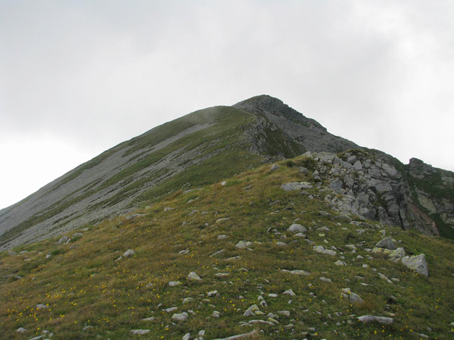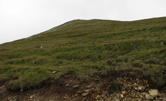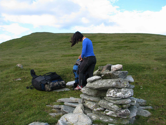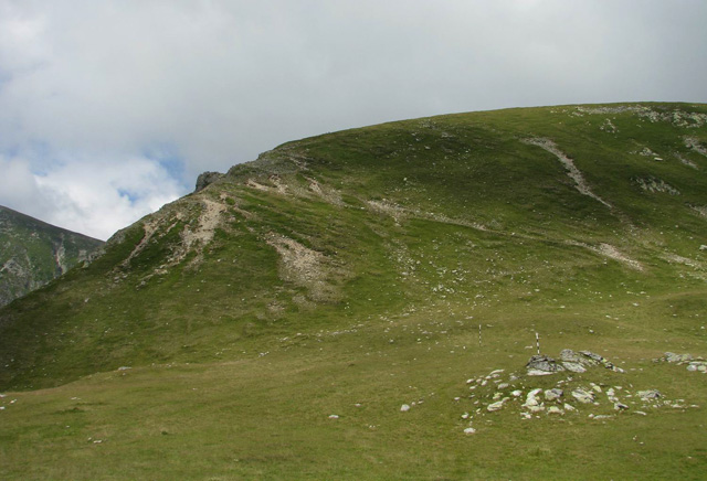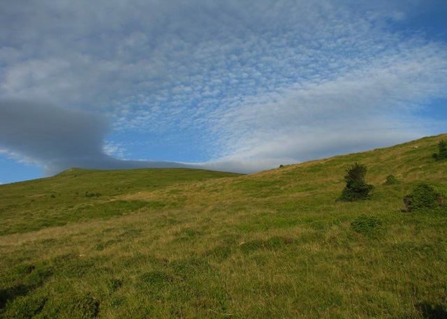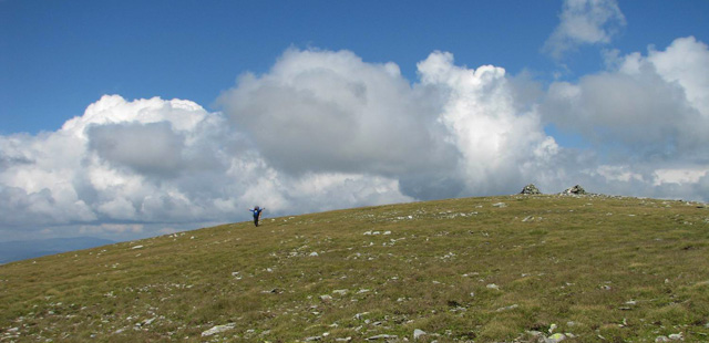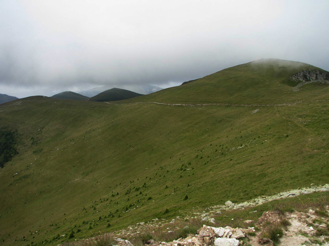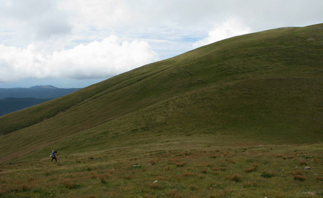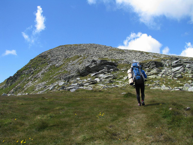 Ne trezim la prima ora a diminetii (adica in jur de 5:00). Dupa ce facem un ceai la care gustam cate ceva, pornim la traseu. Revenim prin ierburi mari  in poteca de culme. Urcam, mergand spre vest. La liziera padurii distingem steagul de pe euro-stana de care ne povestise bacita. In stanga noastra si mai in urma se vede Buila-Vanturarita. Amintiri, trasee de alpinism… La un moment dat in fata noastra se desfasoara impresionantul Vf Ursu. Ne indreptam catre acesta, pana cand suntem foarte aproape de culmea sa somitala. Facem fiecare cate o poza, bucurosi! Dupa ce urcam pe un umar, poteca larga se orienteaza in jos spre stanga. Studiind harta si busola, identific parcursul nostru care se desfasoara de-a lungul unei culmi. Nu e o poteca clara, mai degraba un hatas… Vremea dadea semne de inrautatire, norii se adunau si ceata se lasa pe culmi. Mergem anevoios prin ierburi, urcand pe Vf Cosana. Dupa o sa, urcam pe Vf Capatana unde gasim momai de piatra. Aici ne odihnim un pic, orientandu-ne mai departe spre traseul ce-l avem de parcurs. Coboram abrupt pe-alocuri, pana in Saua Funicelul. Cativa culegatori de afine aveau de lucru. Urmeaza un urcus accentuat,  care se mai domoleste pe masura ce castigam altitudine. Iesim in culme, undeva intre Vf Beleoaia si Vf La Nedei. Norii sunt tot mai negri. Un om ne indica directia buna, zicandu-ne totodata ca „o sa ne saturam de munte”. Nu stia cat de pasionati suntem! Urcam in apropierea momailor de pe Vf Nedeia (dreapta),  trecand printre oi si caini. Coboram apoi de-a coasta, pe o poteca bine conturata. Bate vantul dinspre dreapta (NE). Trecem de Vf Negovanu iesind in saua omonima. In spate zarim Piatra Tarnovului. In dreapta se desfasoara Masivele Latoritei si Lotrului. In fata, tot mai mare, este Parangul (Vf Micaia).Continuam sa mergem, pe langa Vf Turcinu Negovanului si Vf Bou. Apare un marcaj banda rosie. Acum am inteles: la intrarea si la iesirea din masiv exista marcaj, in rest…  Ploaia incepe destul de tare. Ne punem protectiile si mergem mai departe. Undeva in dreapta sunt Cheile Latoritei si Lacul Petrimanu. Noi coboram intens, ajungand in Curmatura Oltetului. Aici intalnim un vechi drum ce vine dinspre Polovragi si coboara apoi la Petrimanu. Dar pentru noi este important ca in Curmatura Oltetului am mai stabatut o etapa din Traversarea Meridionalilor, iesind din Masivul Capatanii, pregatindu-ne pentru Masivul Parang. Ospitalitatea a fost deplina la Stana din Curmatura Oltetului, unde bacita olteanca ne-a ospatat cu ciorba si desigur urda si branza cu mamaliga! M-am delectat, rearanjand un cub-rubik ce-l avea nepotelul ei. Cand s-a lasat seara, MAC-ii au adormit ascultand povestile despre peripetiile bacitei si sotului ei, adevarate haiduceli petrecute in Masivul Capatanii.
