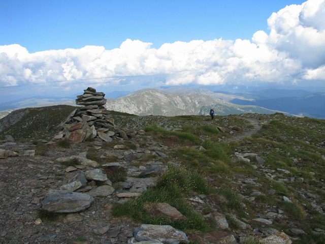 Din Curmatura Oltetului  urcusul este destul de abrupt la intrarea in Masivul Parang. Panta Varfului Micaia si rucksacii nostrii grei ne cam pun pe pufait… Pe masura ce urcam, admiram peisajele din jur, respectiv Muntii Latoritei si Lotrului,  in spate Muntii Capatanii,  in sus momaia de pietre de pe Vf Pristosul  (premergator Vf Micaia). Cum noua ne-a placut matematica, urcam matematic catre varf. Asa, pas cu pas, ajungem pe Pristosul,  dar vedem ca mai avem ceva de urcat pana pe Micaia. Continuam sa urcam si dupa un timp ajungem pe largul Vf Micaia. Bate un vant rece din dreapta (N)! In zare vedem stancariile Parangului de Vest (cel mult mai cunoscut de turisti), ce par a fi acoperite cu zapada (datorita culorii albe a stancilor). E departe, mai e mult de mers! Incepem sa coboram de pe Vf Micaia, zarind in vale cativa stalpi de marcaj. E bine! Chiar daca avem mult de mers, macar vom fi ghidati ca-lumea! In fata-stanga, observam asezarea Ranca. In timp ce coboram, vantul il resimtim tot mai rece. Ne mai imbracam cu cate ceva, fiind pregatit sa-mi pun si manusile. Si suntem in august !… Ajungem intr-o sa cu lac (Saua Balescu), unde ar fi loc bun de cort, daca nu ar batea vantul. Continuam sa mergem, abordand un urcus. Din sens contrar vedem o haita de turisti, care, cand am trecut pe langa ei, ne-am dat seama ca sunt ceho-slovaci. Numai astia umbla cu turma! Continuam sa urcam, iesind in Saua Galbenul. Aici e mai cald, nu mai bate vantul, asa ca ne dezbracam (nu de tot!).  Urcam mai departe pana pe Vf Galbenul. Privesc spre stancariile Parangului vestic. Parca ne-am mai apropiat! Mergem pe poteca in vecinatatea Vf Papusa,   zarind serpentinele soselei Transalpina (cel mai inalt drum national din Romania). Noi tot mergem inainte. Dupa o vreme coboram pe sosea in Saua Dengherul. Asfaltul e exact ce ne trebuia la mersul nostru in bocanci!… Cei din masini se uita curiosi la cei doi MAC-i cu rucksacii lor mari ce-i duceau in spate. Noi continuam sa mergem, pana ce un nene binevoitor ne duce cu jeep-ul dincolo de Pasul Urdele. Coboram abrupt de la nivelul soselei, ca mai apoi sa urcam pieptis pe Vf Iezerul.  Ne oprim pentru pauza de masa, admirand Mohorul. Mancam din plin urda si branza cu rosii, pomenind-o pe bacita! Urda dincolo de Urdele! Dupa „festin” continuam sa mergem, coborand intr-o sa,  angajandu-ne apoi in urcusul pe Mohorul. Depasim niste turisti ce veneau din sosea, care apoi i-am lasat in urma tot mai mult (desi noi pornisem mult mai de departe!). Mohorul e obositor, dar pana la urma iesim pe curba de nivel,  lasand varful in spate.  Zaresc doua turme de oi,  dar aici masivul e mai umblat si nu avem probleme la trecerea printre mioare si caini. Poteca o ia la dreapta, pe sub Vf Plescoaia, urcand spre Vf Setea Mare.  Trecem de ramificatia spre Lacul Calcescu  (de unde mai veneau turisti), continuand sa urcam.  Dupa o vreme suntem pe Vf Setea Mare, fiindu-ne sete! Continuam sa mergem spre Setea Mica, admirand peisajele cuprinzatoare ale Parangului. In fata vedem creasta dintre Vf Parangul Mare si Vf Carja,   spre Coasta lui Rus  in spate Obarsia Lotrului,  iar traseul nostru continua pe creasta spre Saua Piatra Taiata si Vf Coasta lui Rus.  Mergem cu atentie printre stanci,  privind pe alocuri la caldarile glaciare din jur.  Vedem Lacul Zanoaga Mare,  precum si Lacurile Setea. In dreptul seii Piatra Taiata, traseul de creasta coboara.  Pierdem altitudine… Oboseala isi face simtita prezenta. Eram plecati tocmai de la Curmatura Oltetului. Si setea ne cam incearca, pe creasta nu am avut unde sa ne reumplem sticlele. Luam o mica pauza in care ne evaluam situatia; decidem sa continuam sa mergem mai departe. Urmeaza un urcus aspru  pe un varf cu momai. Cand a urcat si Andreea, s-a bucurat  crezand ca-i Vf Parangul Mare… Dezamagirea a cuprins-o vazand ca pana pe respectivul varf  mai e ceva…  Continuam sa mergem pe culme,  privind in dreapta la Lacul Rosiile si Lacul Lung.  Traseul ocoleste prin stanga Vf Gruiul,  iesind in urcare in saua omonima. Se aud voci dinspre cei care au campat langa Lacul Mandra.  Noi ne pregatim pentru asaltul final: urcusul pe Vf Parangul Mare. Incet-incet, urcam pe cel mai inalt varf din Oltenia,  Vf Parangul Mare. Ne imbratisam bucurosi!  Peisajul e frumos si cuprinzator.  Ma uit in zari, de unde am venit.  Dimineata priveam invers si era atat de departe!… Fara a zabovi foarte mult, pornim iar pe poteca  avand ca directie Vf Carja. Trecem de varfurile Gemanarea si Stoienita, zarind la un moment dat Lacul Verde.  Pe masura ce inaintam, in fata apare Custura Mija – Carja. In dreapta vedem Lacul Carja. Continuam sa mergem si urcam pe Vf Carja.  Negurile incep sa apara. Coborarea aspra de pe Carja ne scoate la refugiul omonim. Nu ne oprim, ci mergem mai departe. Soarele e la amurg.     Intr-o sa, cativa cai pasc, in timp ce un armasar cam vrea sa ma alerge… Mergem pe poteca marcata ce coboara de-a coasta. Se lasa intunericul, asa ca ne punem lanternele. Iesim intr-o sa de unde vedem luminile localitatilor de pe Valea Jiului.  De aici in scurt timp ajungem la cabanele de la IEFS (ora 22:00), unde inoptam dupa o zi de mers plina.  Eu repet doua intrebari: aveti apa de baut? E cald? Cabaniera, fara ca sa inteleaga exact de la ce departare venim, ne ofera o camera buna si o masa copioasa. Noaptea visez la cursa noastra pe care noi doi, cu rucksacii grei, am parcurs-o intr-o singura zi pornind de la Curmatura Oltetului pana la IEFS, pe Crestele semete ale Parangului.
