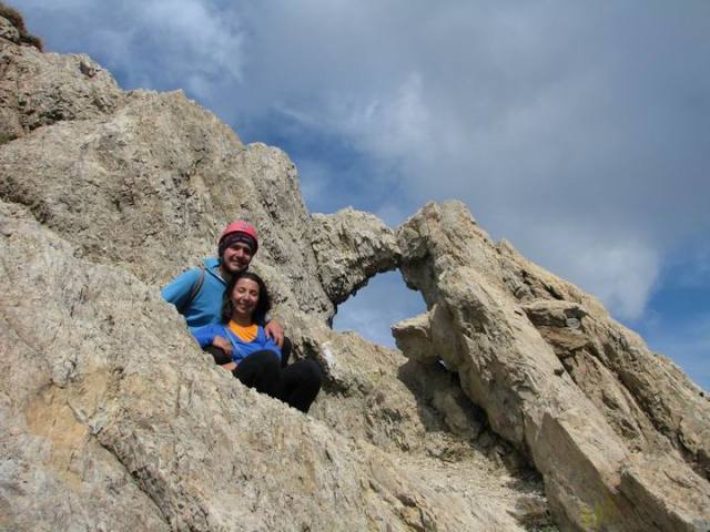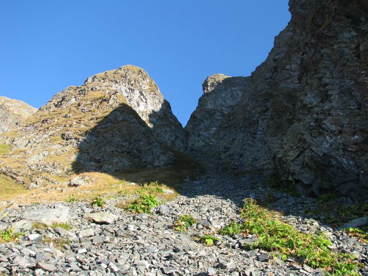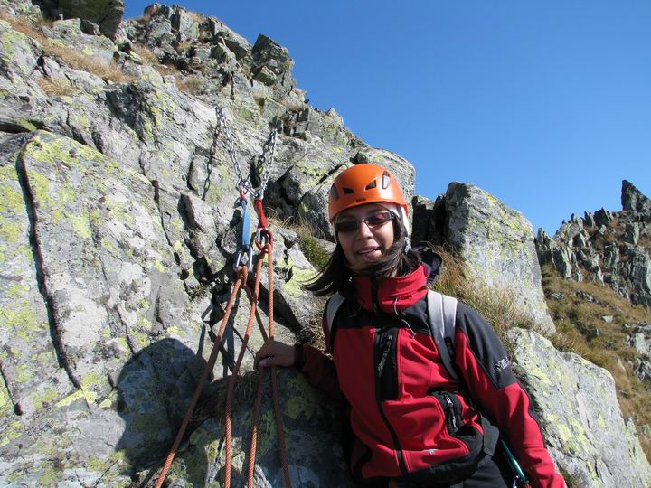Duminica dimineata eu si Andreea (MAC) pornim prin Caldarea Fundu Caprei,   admirand undeva Acul Revolver,  indreptandu-ne spre Portita Arpaselului (acel Mare V).  Odata ajunsi chiar in sa, ne echipam analizand totodata parcursul in peretele Vf Portitei. Bate vantul destul de tare si e cam rece. Incep sa ma catar cu atentie, mai ales ca zona e cam friabila. ( videomontaj cu catararea Santinelei Portitei Arpaselului ) La surplomba regrupez.