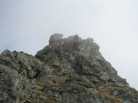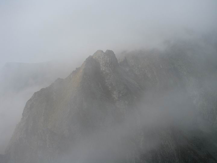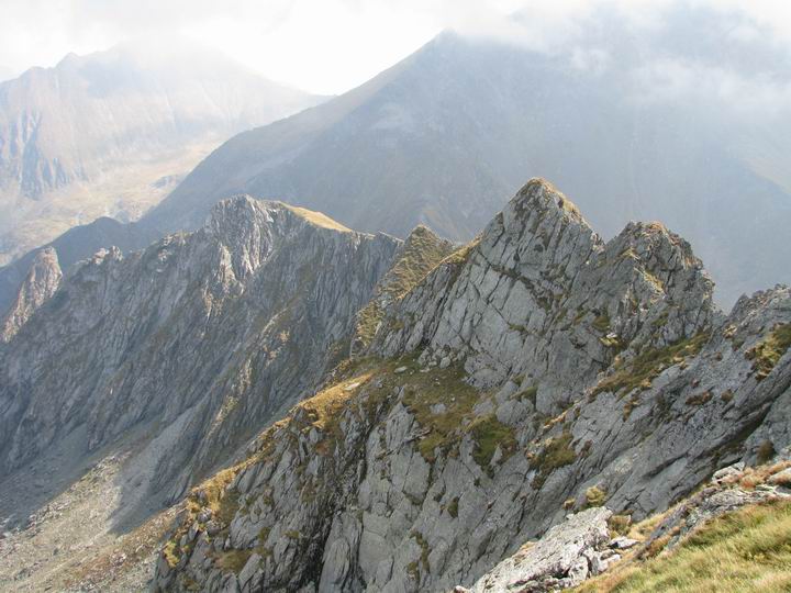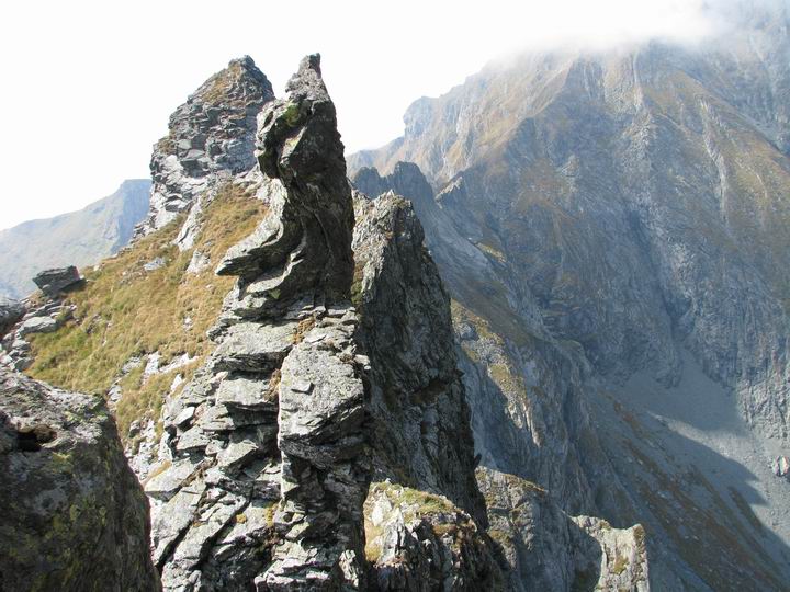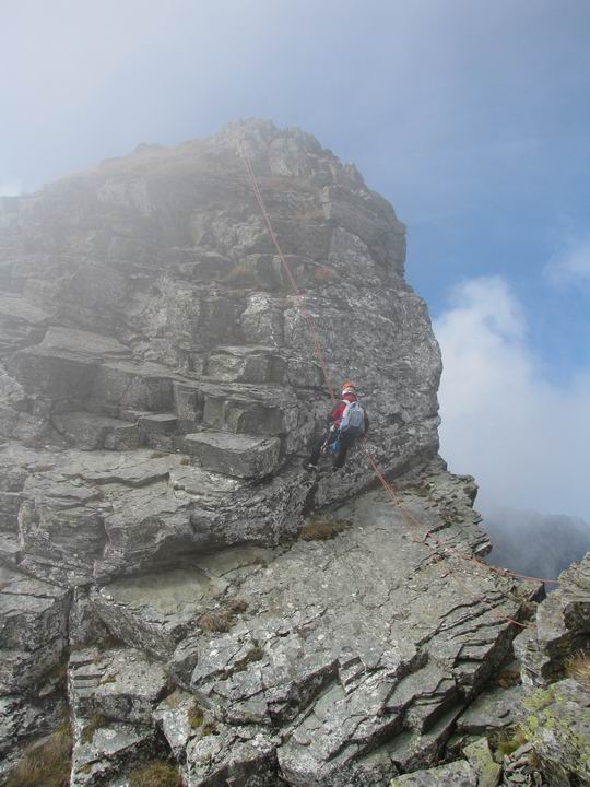 Ajung in locul unde se face rapelul lung pe sensul dinspre est. Regrupez. Andreea a abordat varianta prin diedrul direct peste surplomba (in stanga-sus); soseste si ea, cu parul in vant !  Admiram Vf Capra si Vf Vanatoarea lui Buteanu.  Pornim spre est abordand un prim tanc, dupa care se zaresc varfuri din traseu (Adam, Urechile, Turnul Vartopel). Continuam sa mergem pe creasta aeriana, uneori ingusta, privind la Creasta Albotei si la celelalte frumuseti din zona.  Ne apropiem de Urechea Vestica a Iepurelui. La baza acesteia, Andreea incepe sa se catere ( videomontajul catararii Andreei pe Urechea de Iepure vestica) . Regrupeaza pe un umar al Urechii Vestice. Negurile aduse de vant sunt tot mai dese. Andreea porneste catararea pe creasta, in timp ce ne intersectam cu cealalta echipa ce venea dinspre est (aici ei rapeland).  Urc si eu ( videomontajul catararii lui Mihai pe Urechea de Iepure vestica) dupa care regrupam pe Urechea Vestica. Negurile si vantul sunt mai intense…  Urmeaza catararea pe Urechea Estica a Iepurelui, in care Andreea porneste din nou cap. Pasajul se prezinta sub forma unui diedru cu o zona usor surplombata (exista 3 spituri pe toata lungimea de coarda). videomontajul catararii Andreei pe Urechea de Iepure estica. Regrupam pe Urechea de Iepure Estica. Printre neguri distingem Vf Paraul lui Adam.  Rapelam de pe Urechea Estica  admirand ce avem de parcurs in continuare: Vf Paraul lui Adam  Vf Fantana si Turnul Vartopel.  S-a mai limpezit! Trecem pe langa Obeliscul Arpaselului,  urcand apoi pe Vf Paraul lui Adam. Privim in urma (spre vest) la Creasta Arpaselului,  apoi in fata la Vf Fantana si Vartopel.  In stanga, Creasta Albotei se infatiseaza frumos.  Urcam pe Vf Fantana, de unde descataram.  Urmeaza urcusul pe Vf Turnul Vartopel, pe care facem un mic popas.  Creasta Arpaselului se contureaza impunator, strajuita in fundal de varfurile Capra si Vanatoarea lui Buteanu. In continuare Creasta Vartopelului este destul de ingusta, aeriana si lunga.  Coboram cu grija, pe creasta uneori sub forma de lamele de piatra, in Cetatea Vartopelului.  Inspre vest admiram peisajele Arpaselului si Vartopelului. Creasta se mai domoleste, MAC-ii relaxandu-se pe un tapsan inierbat. Incet-incet, privind la ceea ce strabatusem,  coboram, avand in fata portiunea de creasta „La Trei Pasi de M…”.  Ne imbratisam bucurosi la Fereastra Zmeilor! Coborand cca o jumatate de ora, ajungem la refugiul Fereastra Zmeilor.  Admiram semeata Creasta Vartopel-Arpasel.  Dupa un timp apar si ceilalti colegi la refugiu. In timp ce coboram spre Transfagarasan, priveam deseori la Creasta Vartopel-Arpasel,  gandindu-ma la traseul pe care tocmai il parcursesem alaturi de Andreea, in Imparatia Fagarasului.