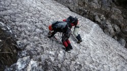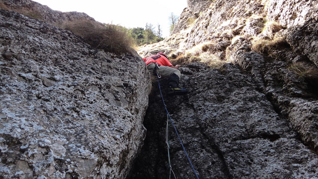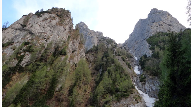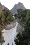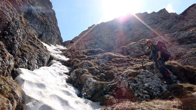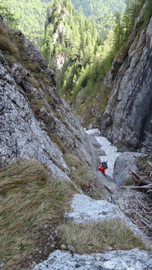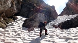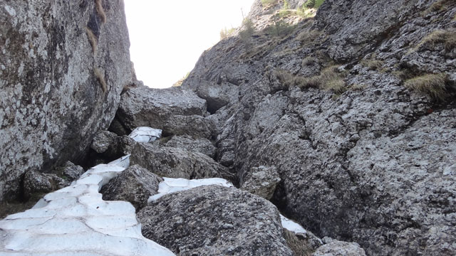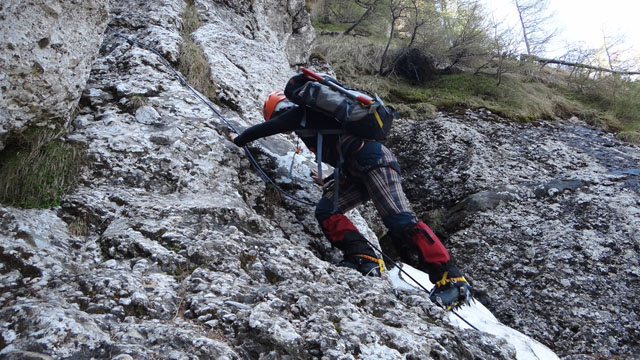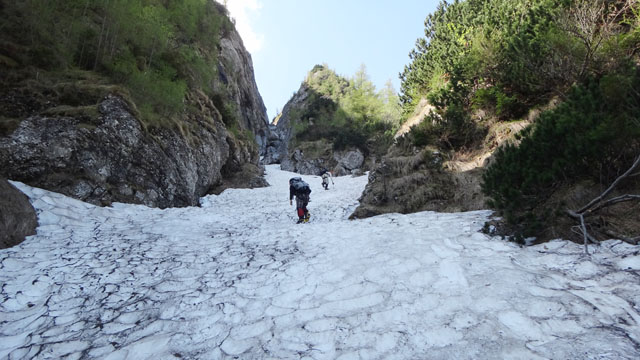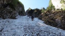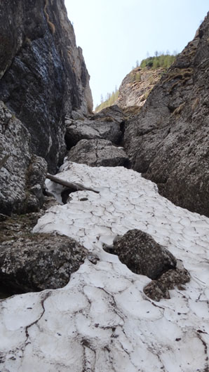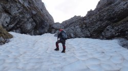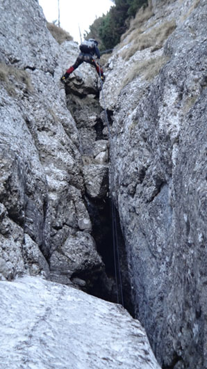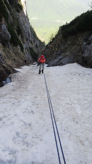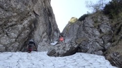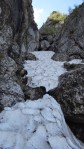 Valea este partial acoperita de zapada tare, saritorile fiind descoperite. Mixt. Ca atare, pe zapada am mers pe coltari, apoi am rapelat la fiecare saritoare.