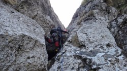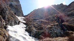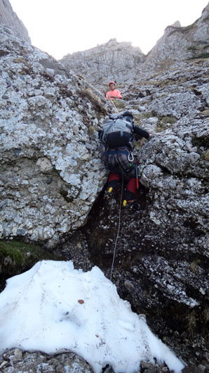 si Malinului. Zapada e discontinua… Ne asteapta o tura de mixt. Vremea e frumoasa, asa ca pornim cu elan. Mai intai rapel prin Hornul Mic pamantos.