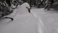 Stratul de zapada avea marimea maxima in zona de altitudine medie si, evident, in locurile unde aveau loc acumulari. In zona somitala, zapada era oarecum mai spulberata, dar tot exista. Pe parcurs am mers in zapada si pana la genunchi. Oricum, pe tot parcursul a fost nevoie de parazapezi.