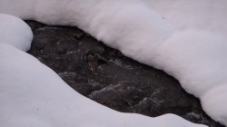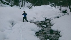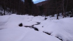 Cand deja se cam intunecase, am iesit la confluenta cu paraul Azugii. Insa mai aveam ceva de mers. La un moment dat, vazand ca nu iesim la liman, am traversat paraul Azuga. Peste sloiuri miscatoare de gheata; iesirea pe celalalt mal a presupus sa ne cataram peste o mica, dar sticloasa cascada de gheata. Totul in intuneric, la lumina frontalelor.