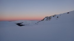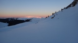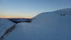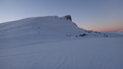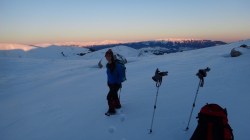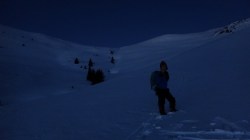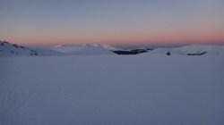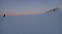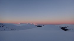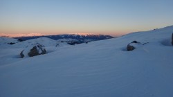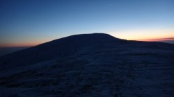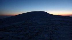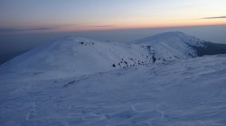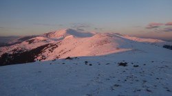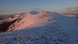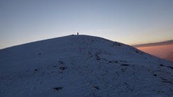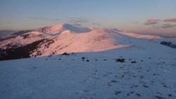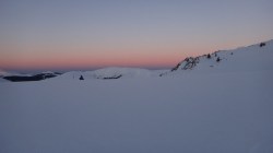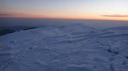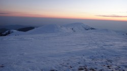 Ne deplasam in lumina crepusculului tot mai scazuta. Si zapada este mare pe alocuri. Mai urcam cate un varf, mai coboram in cate o sa larga…Ne miscam. O silueta se contureaza in fata, in continuare nu se mai vede nimic inalt – este Varful Romanescu.