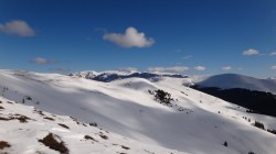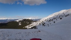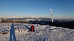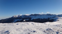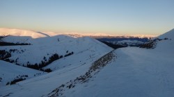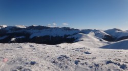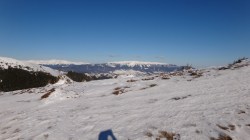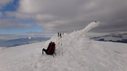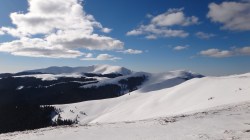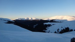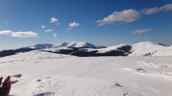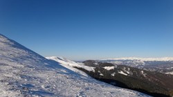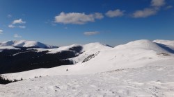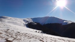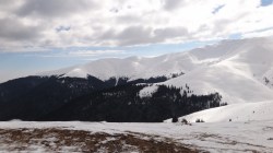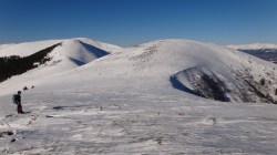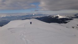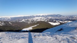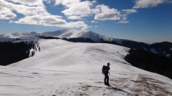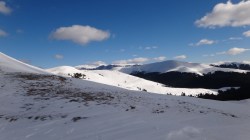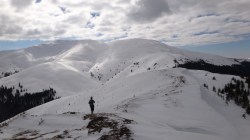Continuam sa mergem pe culmea inzapezita. Undeva in dreapta, pe un picior de munte, vedem stana din Cumparata Crucii.