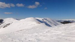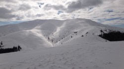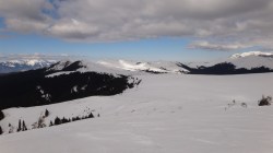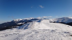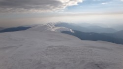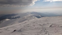 Continuam sa mergem pe culmea Leaotei, prin zapada. Apar cateva doua varfuri, apoi ajungem in Curmatura Tancavei. Privesc inapoi la Varful Leaota si Culmea Rateiului.