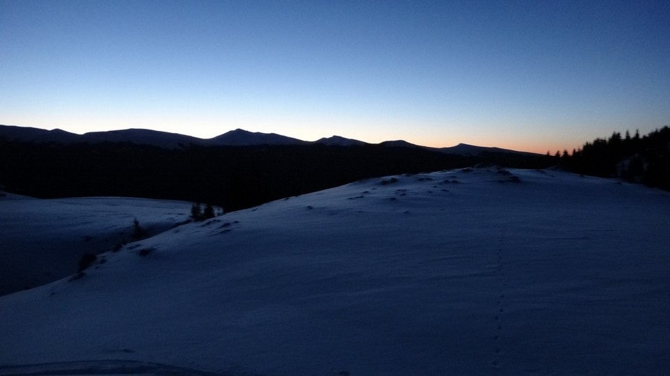 Ne deplasam in lumina crepusculului tot mai scazuta. Si zapada este mare pe alocuri. Mai urcam cate un varf, mai coboram in cate o sa larga…Ne miscam. O silueta se contureaza in fata, in continuare nu se mai vede nimic inalt – este Varful Romanescu.