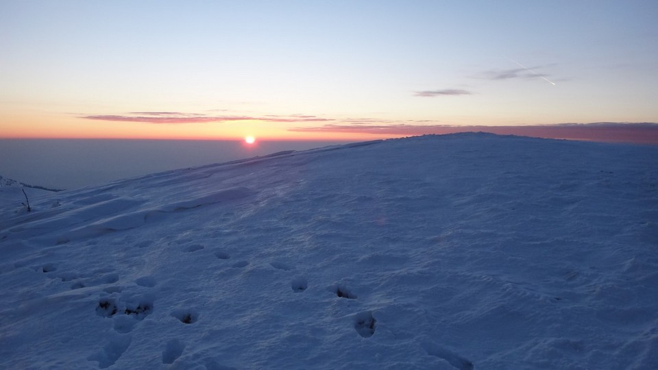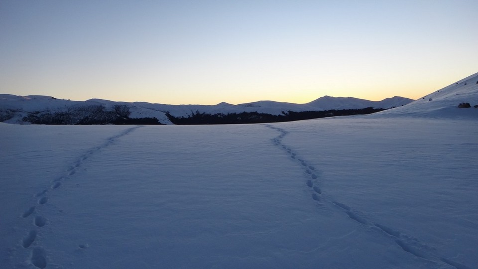 Ultima reduta din suita nenumaratelor varfuri ale Leaotei.Andreea vine si ea cu rucsacul in spate. Fara a mai sta pe ganduri, incepem sa urcam si pe acest ultim varf. In apropierea punctului somital ne angajam spre stanga. Zapada este mare si se lasa intunericul. Ne aprindem lanternele frontale. Incepem sa coboram pe piciorul Romanescu de langa Marginea Domneasca. De cand asteptam aceasta coborare. Nametii sunt din belsug, dar avem elan. Apar iar urme multe de lupi. Recente. Urmeaza un pasaj de urcare ce ne conduce intr-o mica poenita. In departari se vad luminile localitatilor dambovitene. Dinspre padure se aud trosnete. Probabil de la animale. O coborare prin zapada destul de mare ne scoate langa Stana de Piatra.