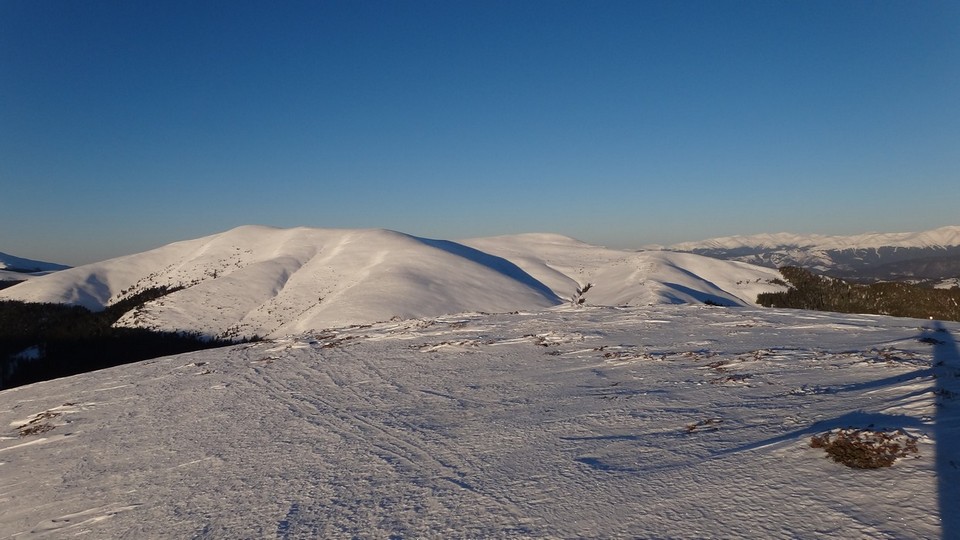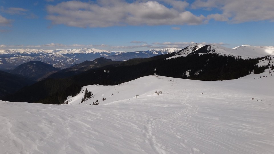 Continuam sa mergem pe culmea inzapezita. Undeva in dreapta, pe un picior de munte, vedem stana din Cumparata Crucii.