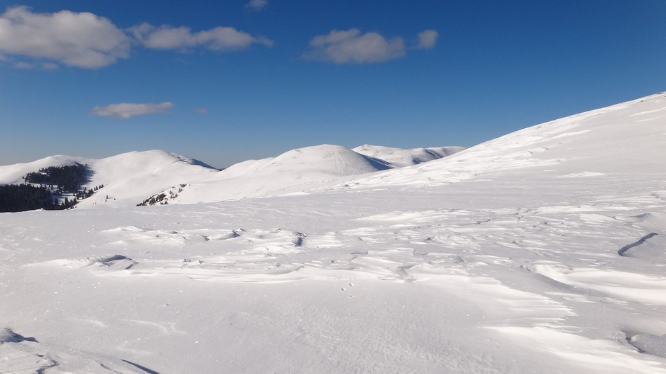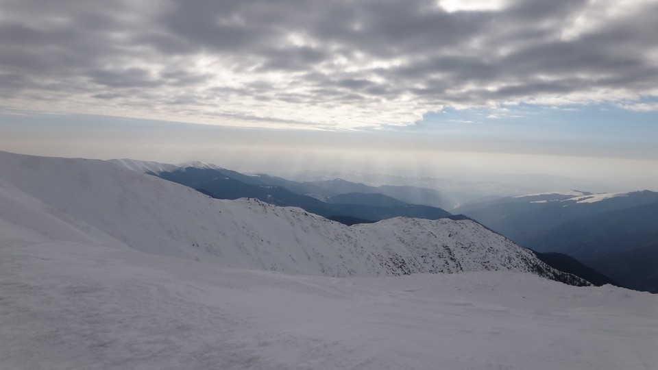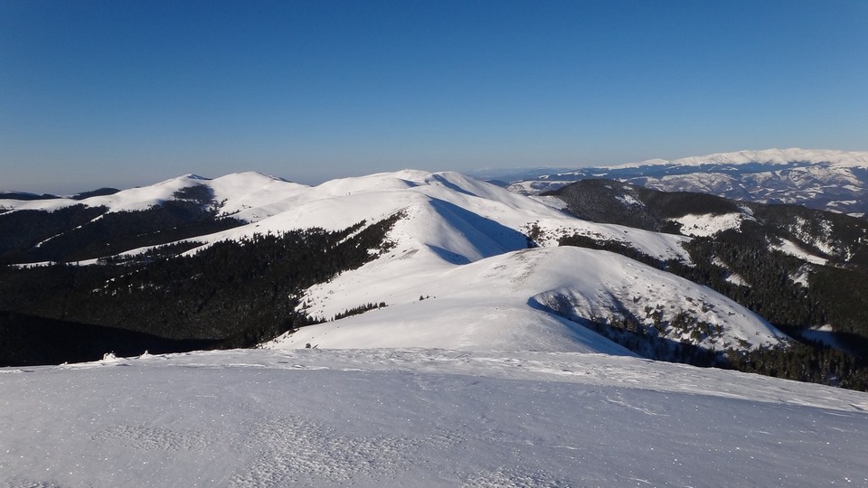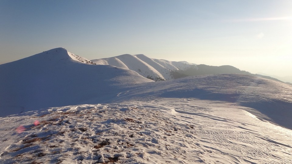 Continuam sa mergem pe culmea Leaotei, prin zapada. Apar cateva doua varfuri, apoi ajungem in Curmatura Tancavei. Privesc inapoi la Varful Leaota si Culmea Rateiului.