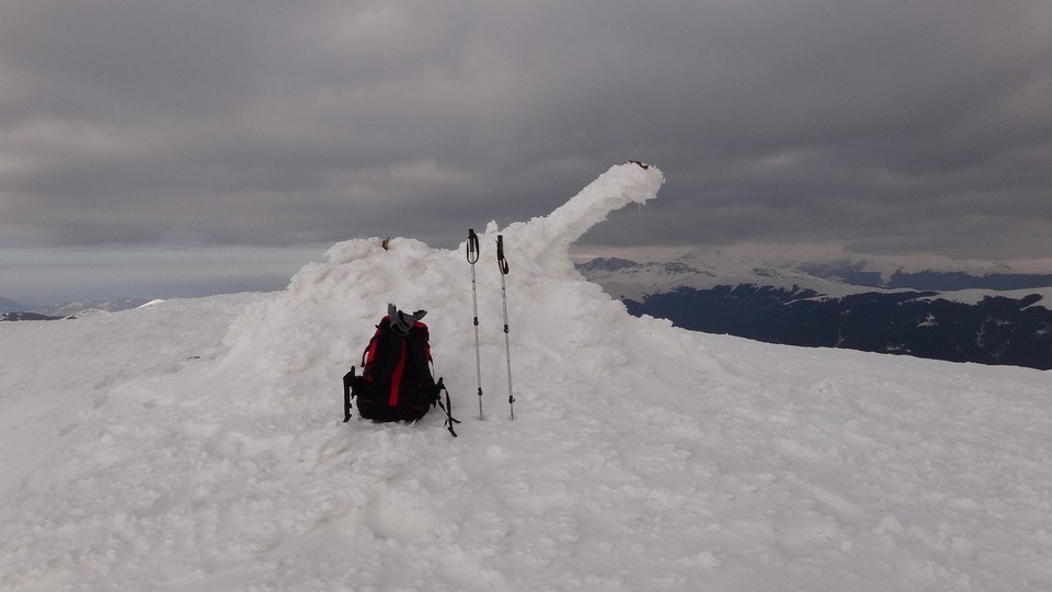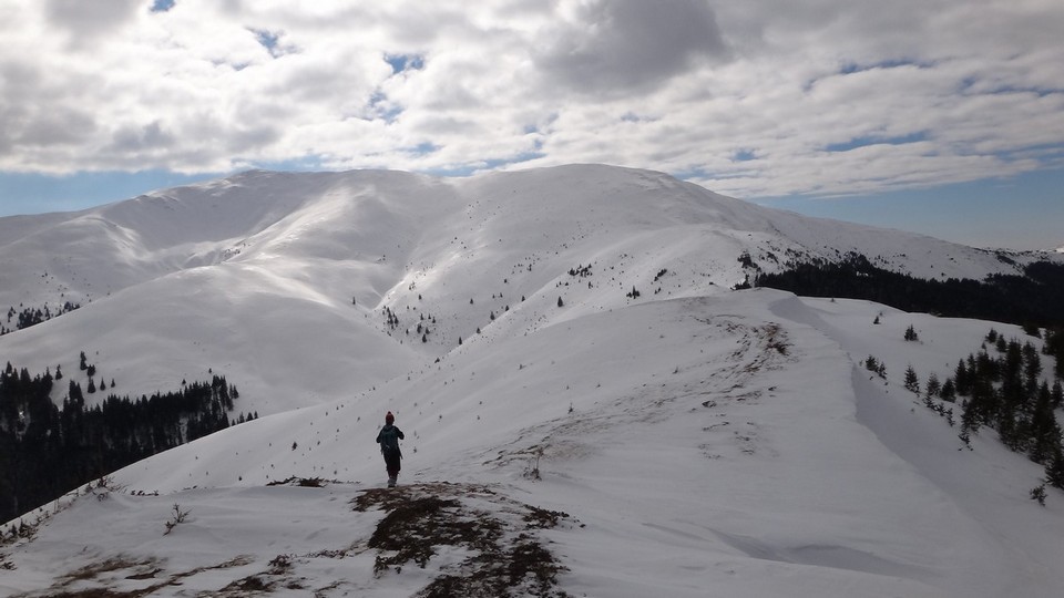 Urcam si pe acesta, ca deja suntem obisnuiti cu urcusul! Mai mergem un pic pe culme si mai urcam inca un varf… Oare cate-or mai fi ? Andreea e in fata, merge bine. Eu,in spate, cu filosofiile. Asezonate cu mers prin zapada.