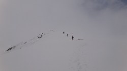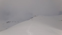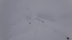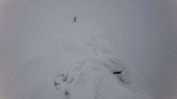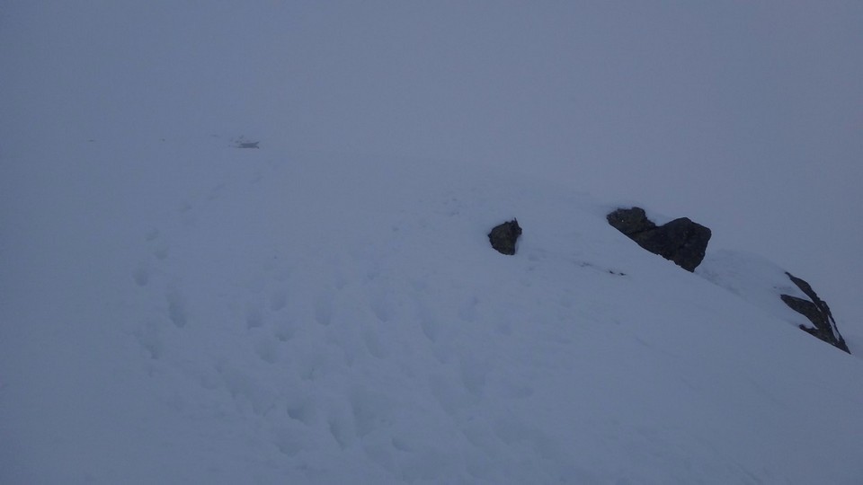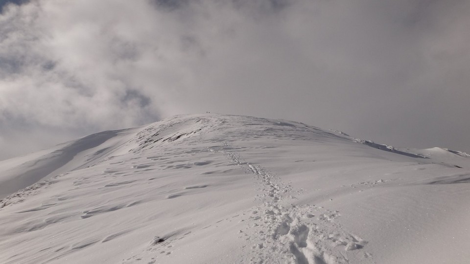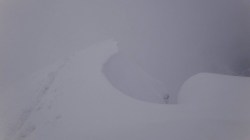 Pe creasta spre Varful Cornul Caltunului este zapada multa cu cornise. Vizibilitatea este scazuta. Ne deplasam cu atentie sporita.
