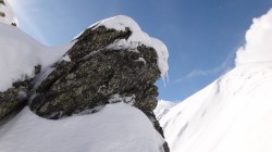 Zapada este destul de mare, fiind cazuta recent. Ajungem in zona traverseului de sub stanci.