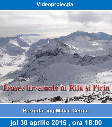 Seara va fi dedicata ascensiunilor pe muntii din tara vecina, Bugaria. Vom proiecta imagini din trasee parcurse pe timp de iarna in Masivele Rila si Pirin, cu atingerea varfurilor reprezentative ale acestora.