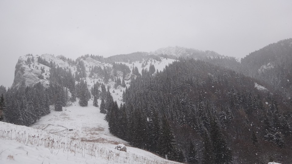 Asadar continui sa urc singur pe piciorul Zaganului. Ninge viscolit si e neguros.