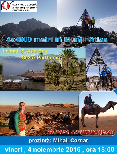Invitatii nostri, Stefan Ene si Cezar Partheniu, ne vor expune imagini din ascensiunile lor pe varfurile inalte ale Muntilor Atlas. Totodata vom parcurge impreuna cu ei si alte zone din aceasta tara.