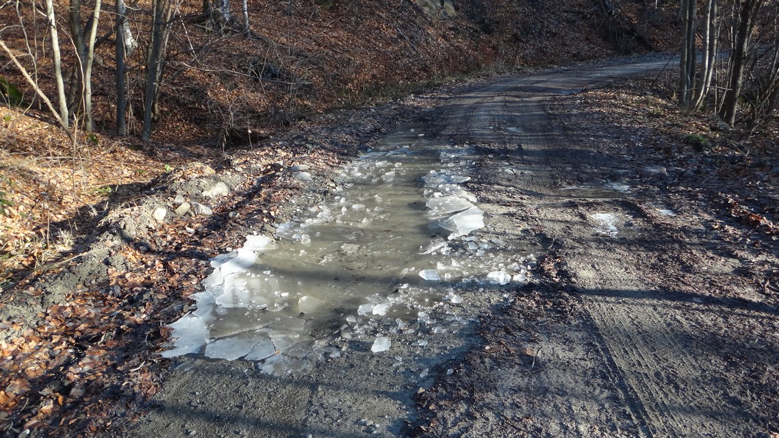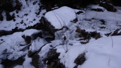 Noi ne deplasam pe Valea Milea. Paraul este inghetat la suprafata.