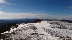 Peisajul se deschide, vedem statia meteo, precum si Varful Penteleu. Urcam.