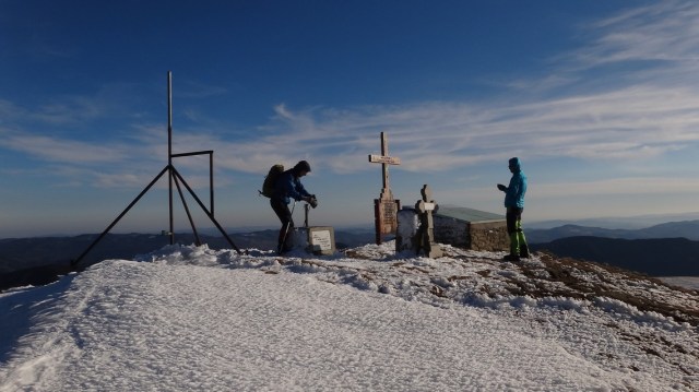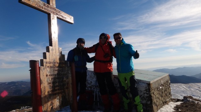Ajungem pe Varful Penteleu alt. 1772 m. Bate vantul rece, dar e bine! Ne bucuram!