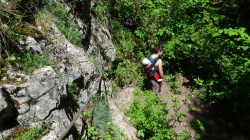 Andreea e cu Stefi in spate si nu se lasa! Eu privesc la peretii de stanca pe la baza carora trecem. Arata impresionant! Undeva in stanga vedem formatiunile stancoase strabatute de cascadele Cetii.