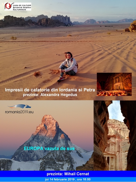 Continuam traditionalele seri de proiectii video de la Schiller; calatoarea si montaniarda Alexandra Hegedus ne va expune imagini dintr-o tara frunoasa, Iordania. Vom vedea diverse obiective turistice, calcand inclusiv pe urmele lui Indiana Jones in renumitul oras antic Petra, inclusiv cu o prezentare nocturna a acestuia.