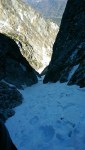 Ne apropiem cat se poate, cautand si amenajandu-ne o regrupare. Saritorile nu sunt de talia celor din Albisoara Strungii (imi amintesc de Andreea cum se catara pe-acolo!), dar trebuie abordate cu grija si atentie, desigur cu tehnica si mijloace de alpinism (coarda, carabiniere, etc.). La acel moment, saritorile erau partial descoperite, existand portiuni cu stanca si gheata. Aici am trecut eu la lucru, legandu-ma si pornind in postura de cap de coarda. Desigur filat de Daniel. M-am miscat si am depasit succesiunea de saritori, regrupand intr-o zona cu zapada inghetata.