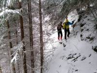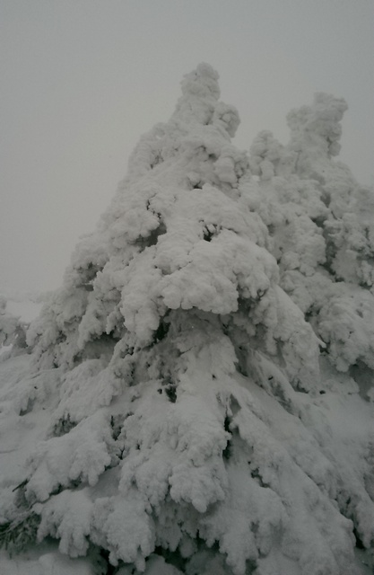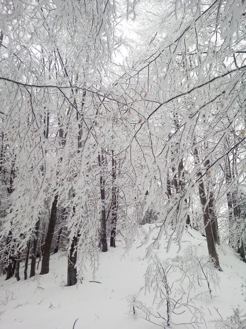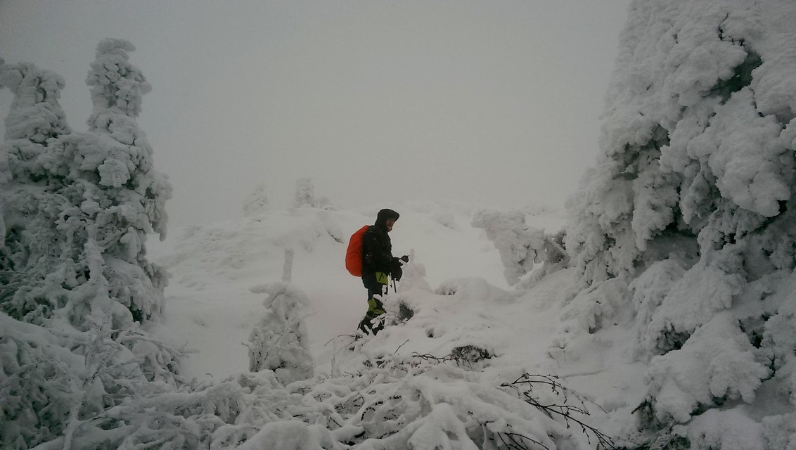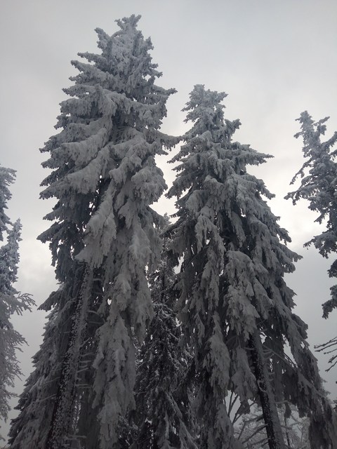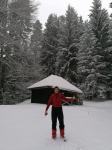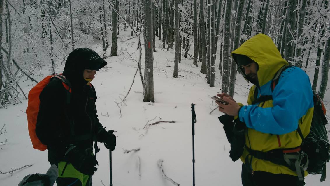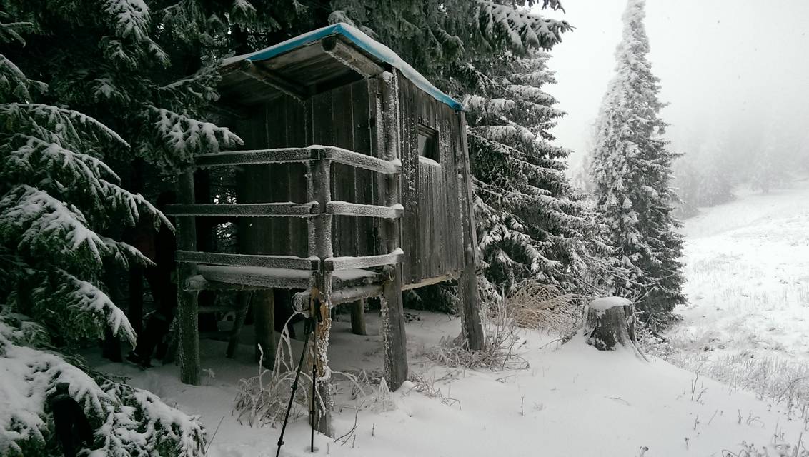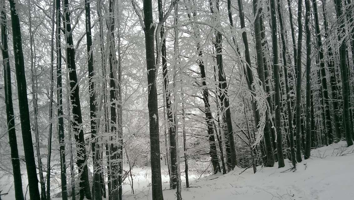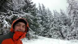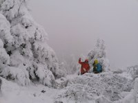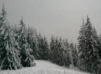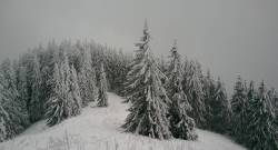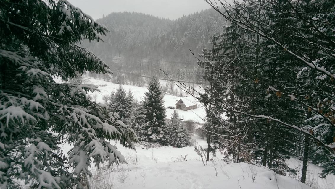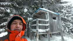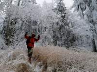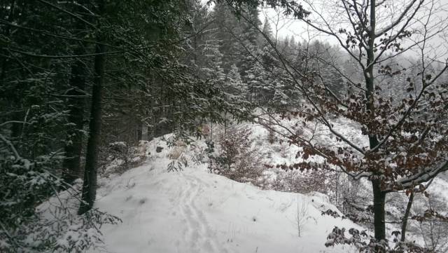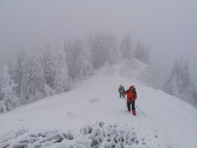 Continuam sa urcam destul de sustinut. O problema o ridica zapada cazuta proaspat si destul de consistenta, care formeaza un strat omogen, derutant la orientare. Eu am mai parcurs de mai multe ori acest traseu, inclusiv iarna, insa acum conditiile sunt destul de aspre. Dar, am venit pregatit. Bine! Si Daniel s-a pregatit, iar Silviu este intotdeauna pregatit! Asa ca avansam pe intortocheta Horvatca. Discutam de tot felul, de munte, de istorie, de echipamente. Dupa un timp (timpul efectiv nu mai conteaza, am venit pregatiti pentru o tura lunga) ajungem la Cantonul Horvatca reper important din traseu. Suntem bucurosi ! Luam o pauza (de „hidratare” – cum ar zice fitosii, de fapt ciugulim cate ceva si bem apa). Continuam traseul prin padurea de argint. E frumoasa ca si imagine, dar derutanta ca orientare. Si inca ceva, e ger ! Sunt deja – 12 C . Un ragaz de orientare, atat de necesar in conditiile date. Traseul este intortocheat, in principiu urca pe o suita de culmi adiacente, insa prezinta diverse „meandre” prin zone impadurite, care fac orientarea dificila, mai ales cand este un strat uniform si pufos de zapada. Totodata ne bucuram de peisajele interesante, cu brazii incarcati de zapada inghetata. Si noua ne e cam frig, mai punem un strat pe noi. De haine, nu de zapada ! Si tot cu povestitul, si tot cu urcatul prin zapada, si tot cu orientatul si re-orientatul, ajungem in poiana cu belvedere. E bine ! In conditii de vizibilitate, aici trebuia sa vedem peisaje cat de cat cuprinzatoare. Acum vedem doar brazii incarcati de zapada. Si, desigur, pe noi intre noi!