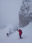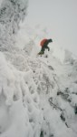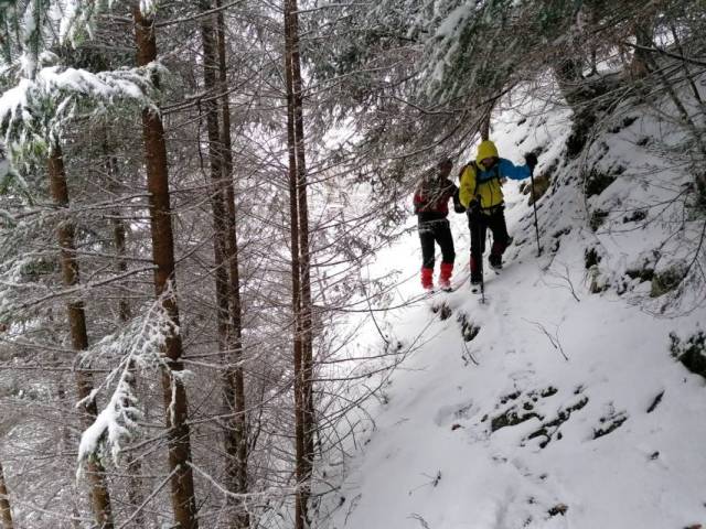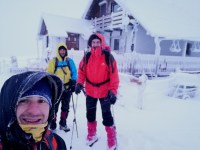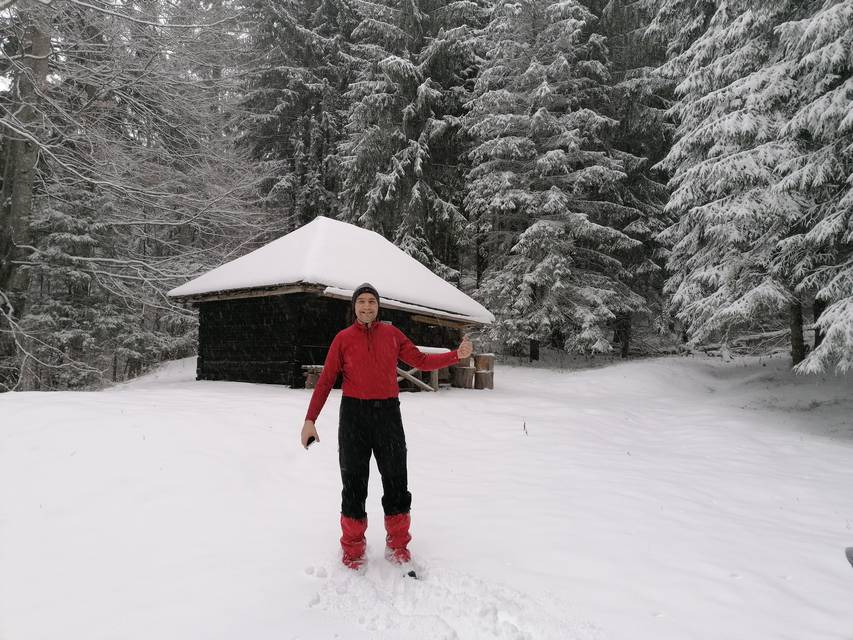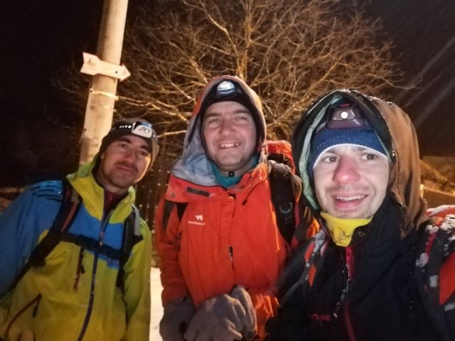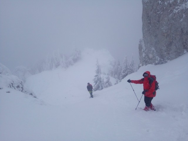 O expeditie incepe intotdeauna de la primul pas. Primul pas la noi a insemnat un picior incaltat intr-o incaltaminte joasa, lejera, pus jos intr-un strat de zapada consistent ce ne-a udat picioarele aproape instantaneu. Apoi echiparea aferenta conditiilor meteo a fost o alta „distractie”. In fine, pornim in tura, trecand printre niste caini („prietenii” mei, dar si ai lui Daniel!). Ii indrum pe colegii-camarazi spre intrarea in traseul Horvatca; un urcus ne ia direct, pieptis. E bine asa ! Ma uit inapoi, ninge si bate vantul sustinut. Oare ce-o fi pe sus ?
