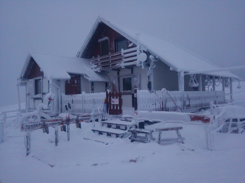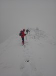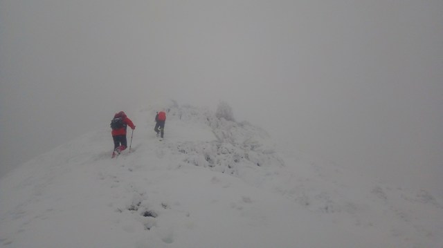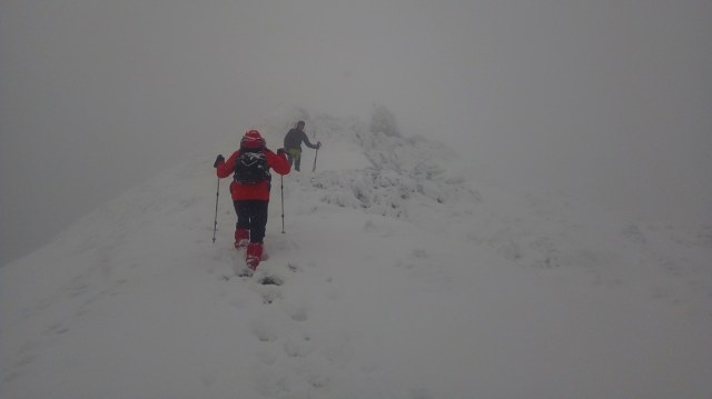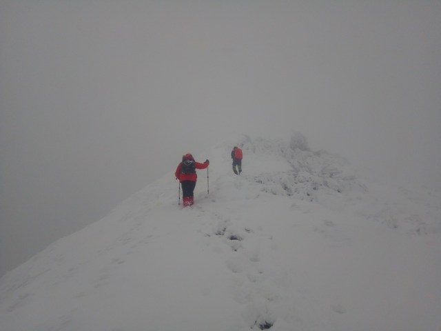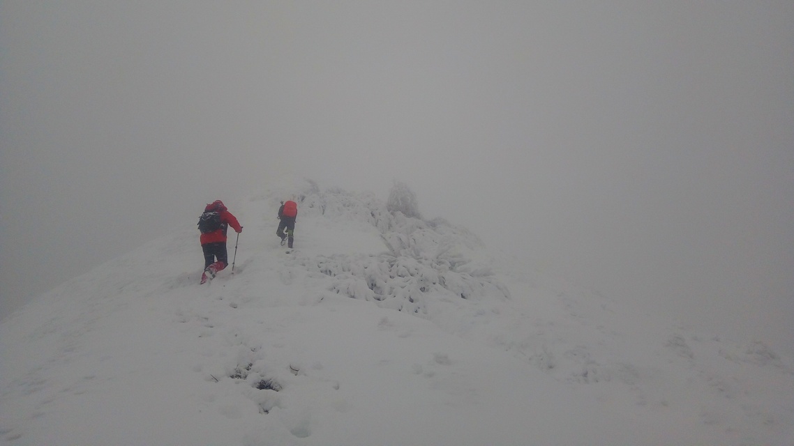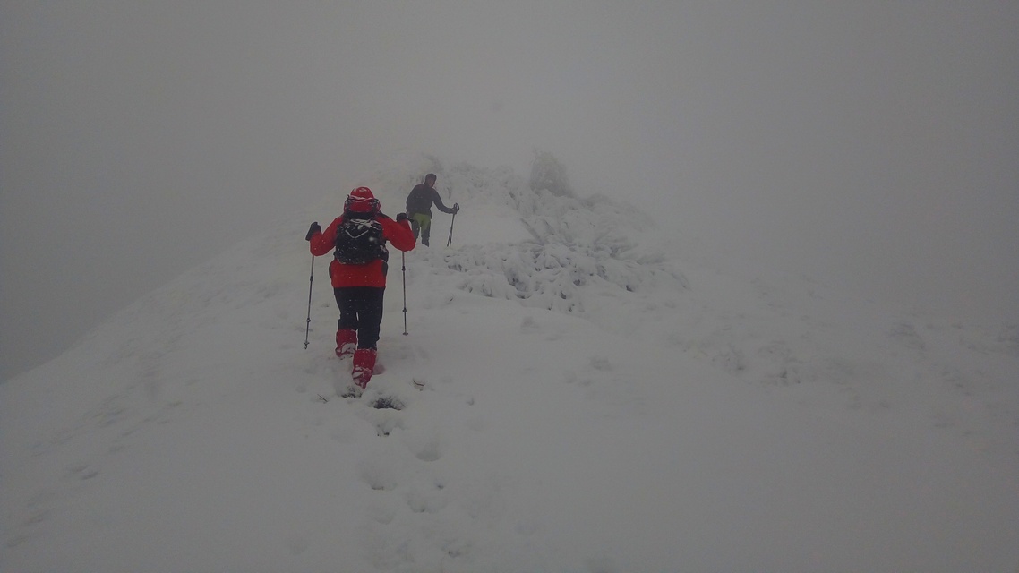 Desi am urcat ceva, ca si altitudine, inca mai avem; si timpul trece, e zi scurta de iarna. Intensificam ritmul. Astfel ajungem la foisorul de observare. Un alt reper important de pe traseu. Poposim un pic, Silviu se uita prin foisor, analizam harta, ceasul si … vremea, care s-a mai inrautatit. Nu degeaba s-a dat avertizare meteorologica de viscol pe crestele muntilor! Personal sunt destul de hotarat, le recomand sa tinem aproape, sa mergem grupat si sa fim atenti la parcurs. Un curent si mai rece il resimtim, combinat cu negura indesita. Sunt -14 C , dar vantul accentueaza senzatia de frig. Pornim mai departe. Urcam prin zapada care este mare in aceasta zona. Totodata trebuie sa fim atenti la abruptul din stanga. Si sa mentinem parcursul bun. Vantul bate tot mai tare, fiindca suntem in zona de creasta, descoperita. Combinat cu ninsoarea intensa si urcusul prin nameti. Mergem compact, cu atentie la stancariile de pe creasta, care sunt derutante. Urcand pe Creasta Somitala spre Varf, in conditiile viscolului si vizibilitatii foarte scazute, ma gandeam la celebrul explorator polar Sir Ernest Shackleton, care in eroicele sale expeditii antarctice a efectuat marsuri pe intinderi nesfarsite de gheata, patrunzand in zone necunoscute, realizand performante semnificative in cunoastrea si strabaterea spre atingerea Polului Sud (pe care insa nu l-a atins…).