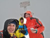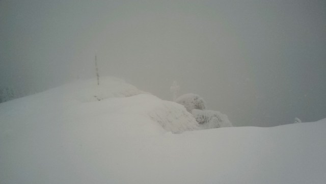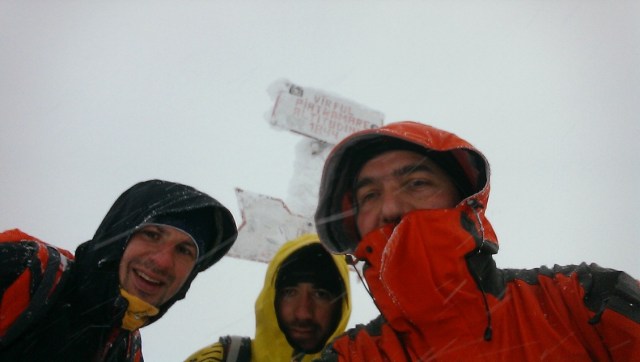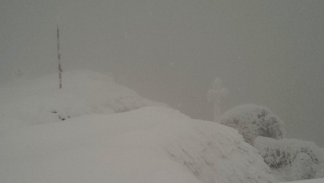 Eforturile ne sunt rasplatite: Varful Piatra Mare, urcat pe traseul Horvatca in conditii de viscol, negura, ger. Ne strangem mainile bucurosi, suntem o echipa de munte temerara. O sun pe Andreea. Privesc la troita din vecinatatea varfului, unde sunt si cornise de zapada. Doamne Ajuta !