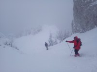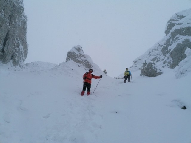 Nu zabovim, ne reluam parcursul fiindca zona somitala a Pietrei Mari devine pe alocuri platou, cu orientare dificila in conditiile date. Mergem cu atentie si ajungem la intersectia cu traseul spre Piatra Scrisa. Noi continuam cvazi-stanga; la un moment dat este o portiune susceptibila la avalanse. O cunosc, am trecut de multe ori iarna pe acolo. Asa ca mergem cat mai indepartati de margine, totodata mentinand parcursul. Ajungem la hornul ce coboara din zona somitala. Aici, de regula, este alunecos, posibilitati de zone cu gheata. Avem la noi coltari, am venit pregatiti; insa nu este cazul, e zapada multa. Incepem sa coboram prin horn. Cu atentie, fiindca sunt pietre sub zapada.