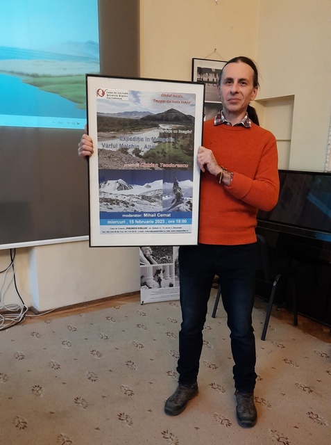 A urmat o scurta trecere in istorie, sustinuta de organizator, cu privire la ceea ce a fost vastul Imperiu Mongol. Odata introducerea facuta, invitatul serii, Ciprian Teodorescu, a dezvoltat tema principala: Mongolia, vazuta in cadrul expeditiei sale; drumuri grele, tinuturi intinse, cai, iurte, povesti si intamplari traite acolo. Punctul culminant a fost ascensiunea pe Varful Malchin (alt. 4040 m) situat in Altaiul Mongol.