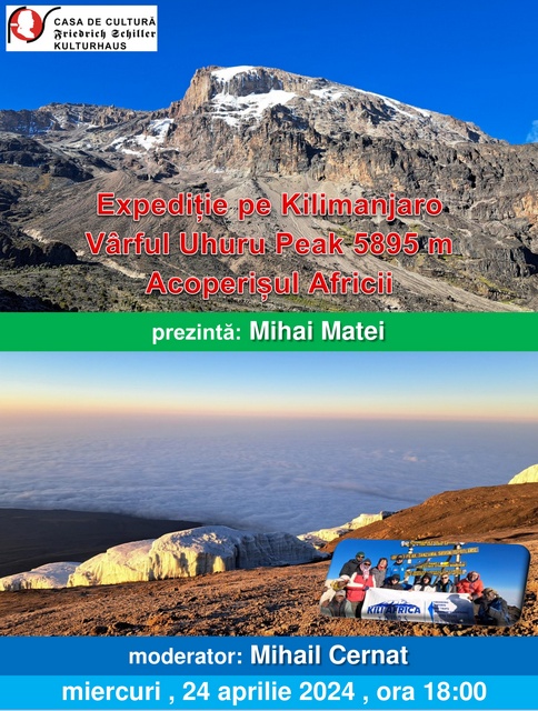 Vă invităm la o seară montană deosebită, în care vom călători în exoticul continent african, delectându-ne cu imagini frumoase prezentate cu carismă, dar și detaliat de către invitatul nostru, trăind împreună emoțiile și bucuria ascensiunii pe Acoperișul Africii – unul dintre cele mai înalte vârfuri din Lume.