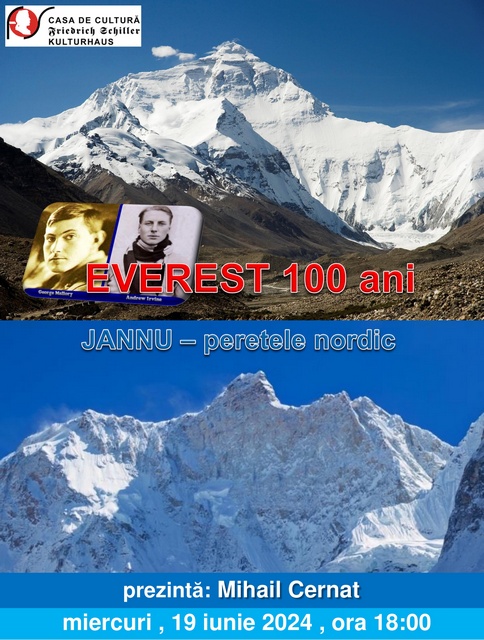Vă invităm, așadar, la o nouă seară dedicată Muntelui, un eveniment special de evocare a EVERESTULUI, a oamenilor din expedițiile desfășurate pentru ascensiunea până pe cel mai înalt vârf. Apoi, rămânînd tot în Himalaya, vom vizualiza o incursiune absolut deosebită, un film documentar despre peretele nordic JANNU.