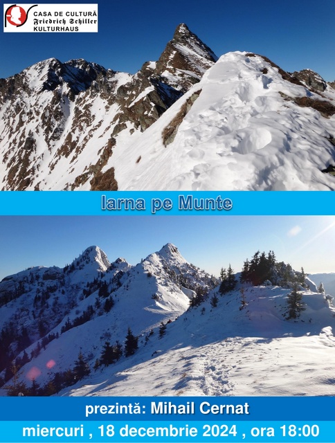 Vă invităm, așadar, la o seară dedicată Muntelui în anotimpul alb, cu trasee interesante și deseori dificile, dar în care vom căuta să simțim plăcerea de a urca pe munte iarna. Sunetul colindelor ne va transpune în magia apropierii Crăciunului.